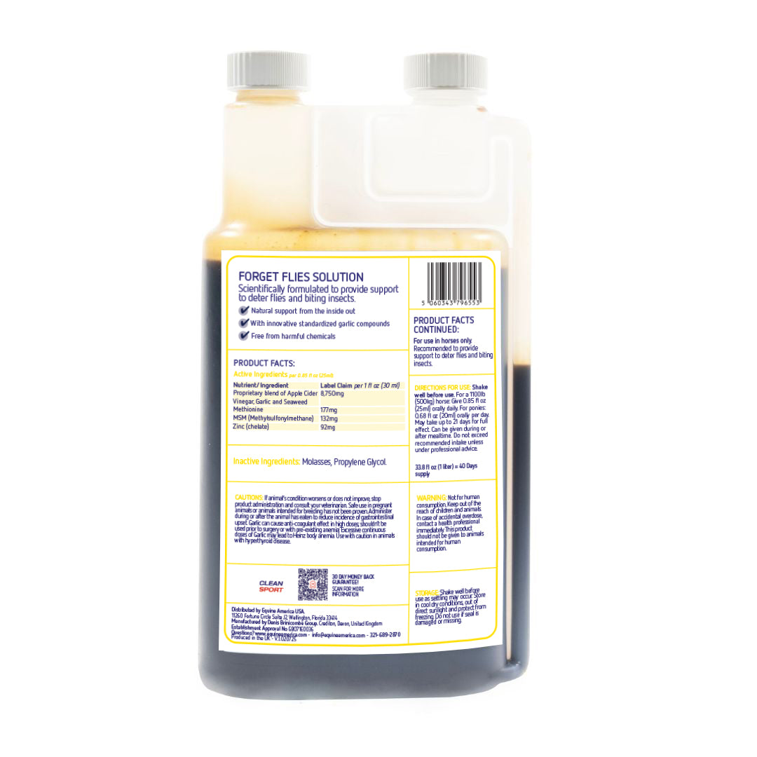 • Equine America is BETA NOPS and UFAS accredited, making Forget Flies In-Feed Solution suitable for horses competing under FEI regulations and the Rules of Racing by reducing the risk of our products containing prohibited substances.